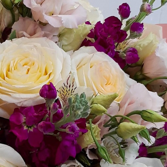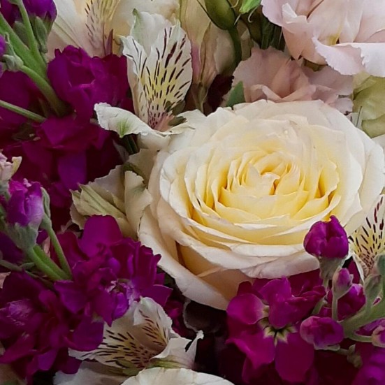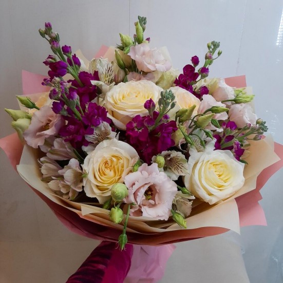 Букет с матиолой и розой и эустомой